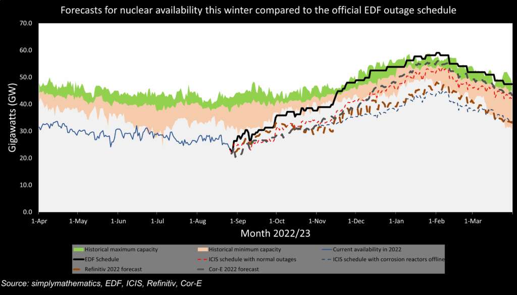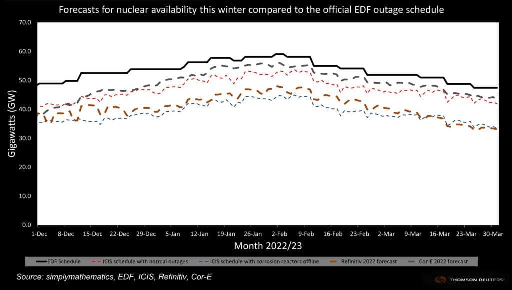 Forecasts for nuclear availability this winter compared to the official EDF outage schedule https://fingfx.thomsonreuters.com/gfx/mkt/egvbkdzqzpq/December%20to%20Jan%20forecasts.png