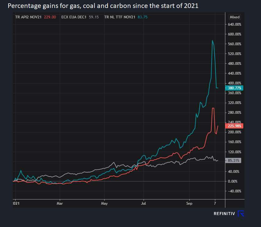 Graphic: Gas, CO2 and Coal rebased to the start of the year, showing percentage gains: https://fingfx.thomsonreuters.com/gfx/mkt/egpbkmyoovq/Gas%20CO2%20and%20coal%20rebased%20to%20the%20start%20of%20the%20year.jpeg