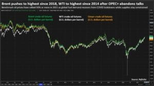 Graphics: Global crude prices push to their highest since 2018 after OPEC+ abandons talks – https://fingfx.thomsonreuters.com/gfx/ce/qzjpqxagzvx/GlobalOilPricesJul2021.png